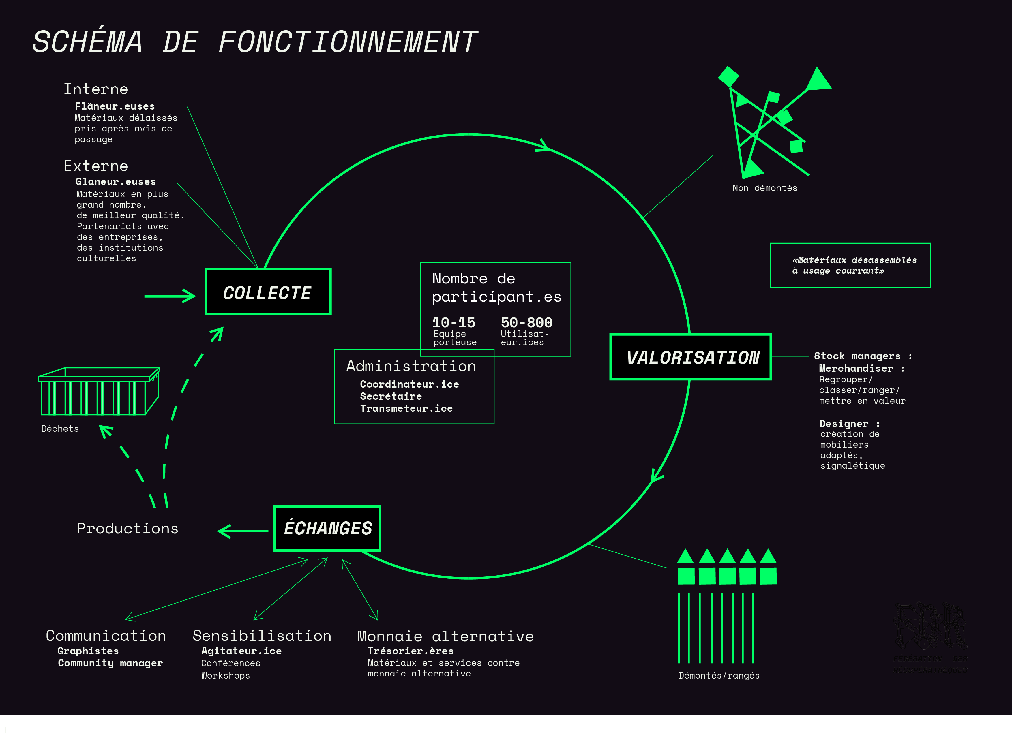Le flânage est prioritaire dans les collectes de matériaux car l’objectif est d’exploiter au maximum les ressources déjà présentes au sein de l’école et de fonctionner en circuit le plus court possible. Dans ce but, des avis de passage sont disposés sur les matériaux ou anciennes projets qui semblent abandonnés. Cette stratégie permet d’alléger certaines zones au sein d’une école et d’anticiper les grands rangements qui ont lieu pendant une année scolaire, souvent complexes et synonyme de pertes de pièces pour les étudiant·es.